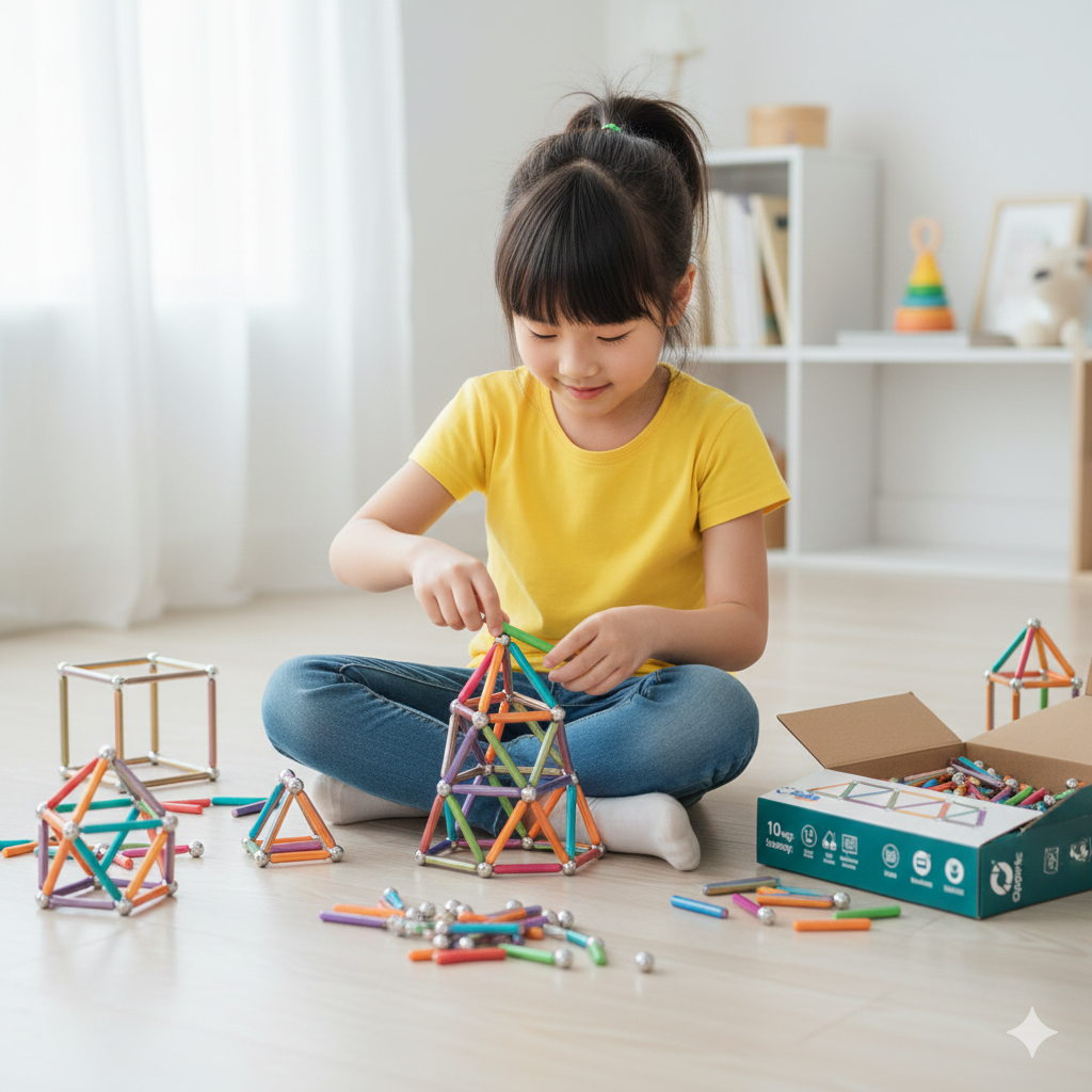 Build 3D Shapes: Kids can easily learn about and construct basic geometric shapes like triangles, squares, cubes, and pyramids, as shown on the box