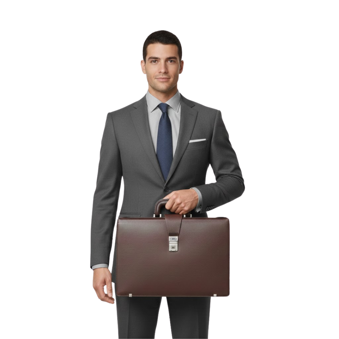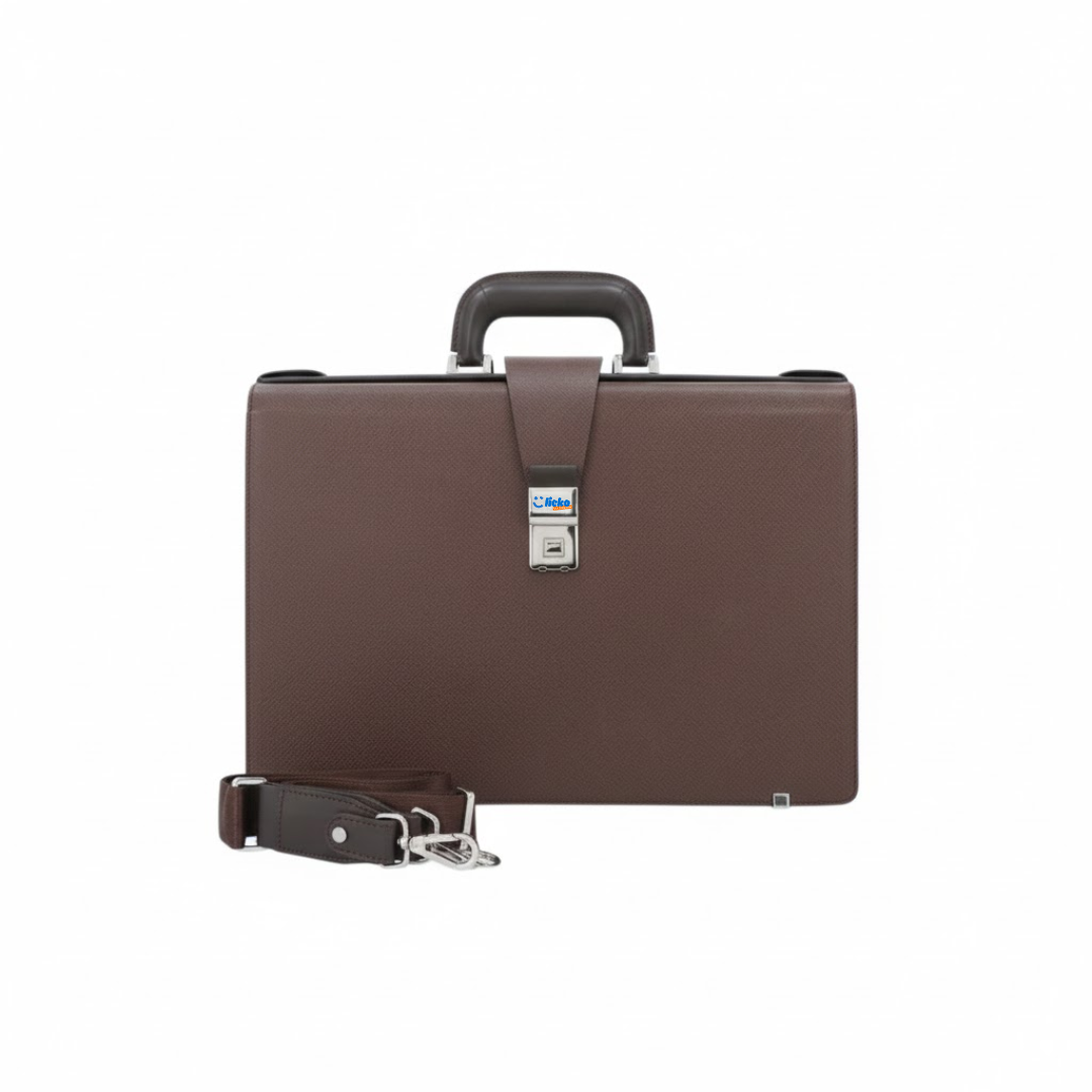 The Executive Classic Leather Briefcase is a refined and functional accessory designed for professionals who value style and organization. Crafted from high-quality brown leather, it features a structured silhouette, a sturdy top handle, and a secure metal clasp closure for added safety. The spacious interior provides ample room for documents, laptops, and daily essentials, while the detachable shoulder strap offers versatile carrying options. Perfect for business travel or everyday office use, this briefcase combines durability, elegance, and practicality in one polished design.