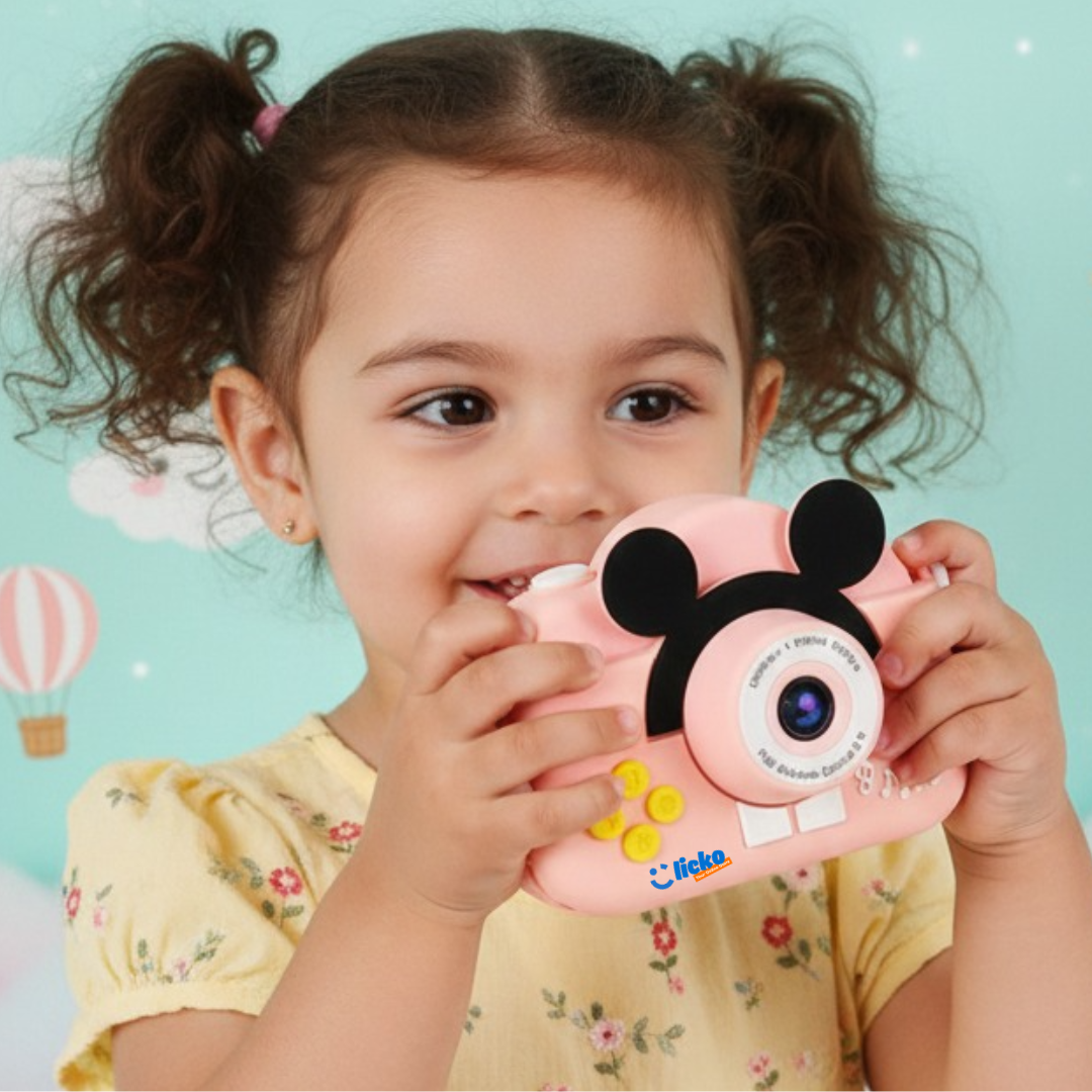 • Design & Color: The camera features a cute cartoon theme, with large black ears (resembling a mouse or bear design) on a soft pink body. The rounded shape and durable materials make it safe and comfortable for small hands.
