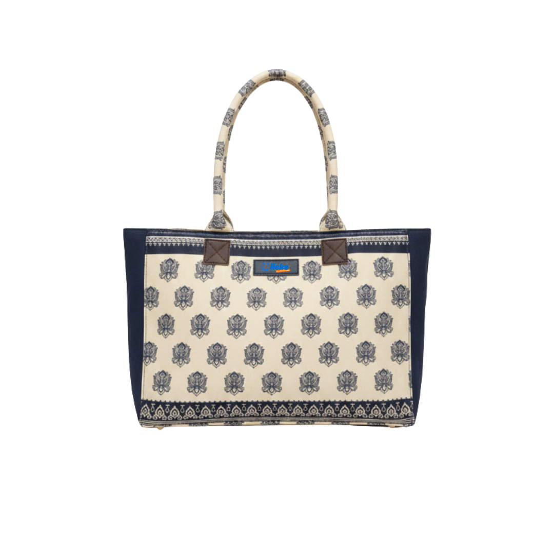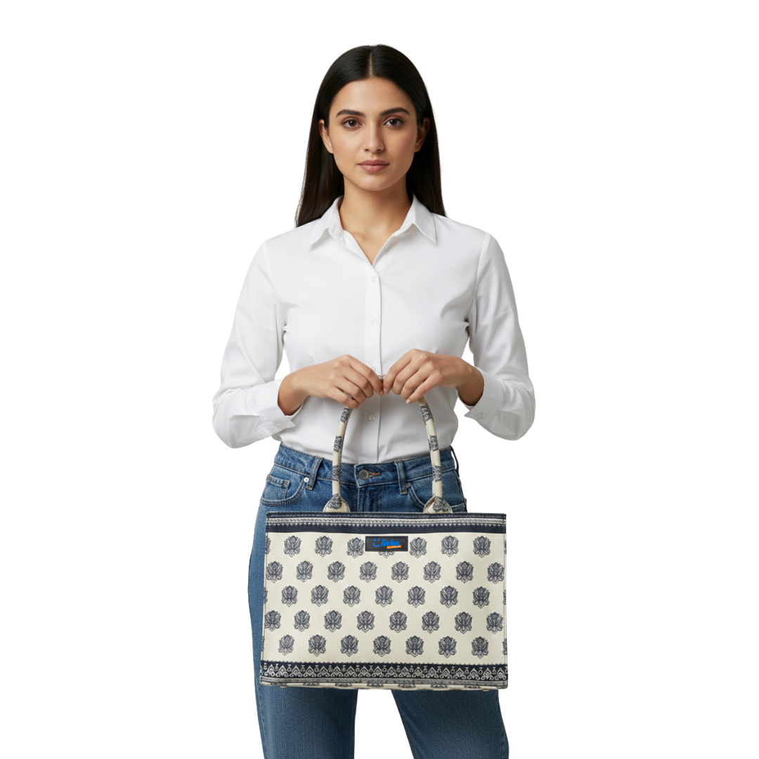 The Navy Heritage Block-Print Tote blends traditional charm with modern utility. Its cream canvas front panel features a repeating navy floral block-print design, complemented by deep navy side panels and detailed border patterns. The sturdy fabric handles, wrapped in matching print, provide both comfort and style, while reinforced brown accents add durability. Spacious, lightweight, and elegant, this tote is ideal for daily use, travel, or pairing with casual and ethnic outfits.