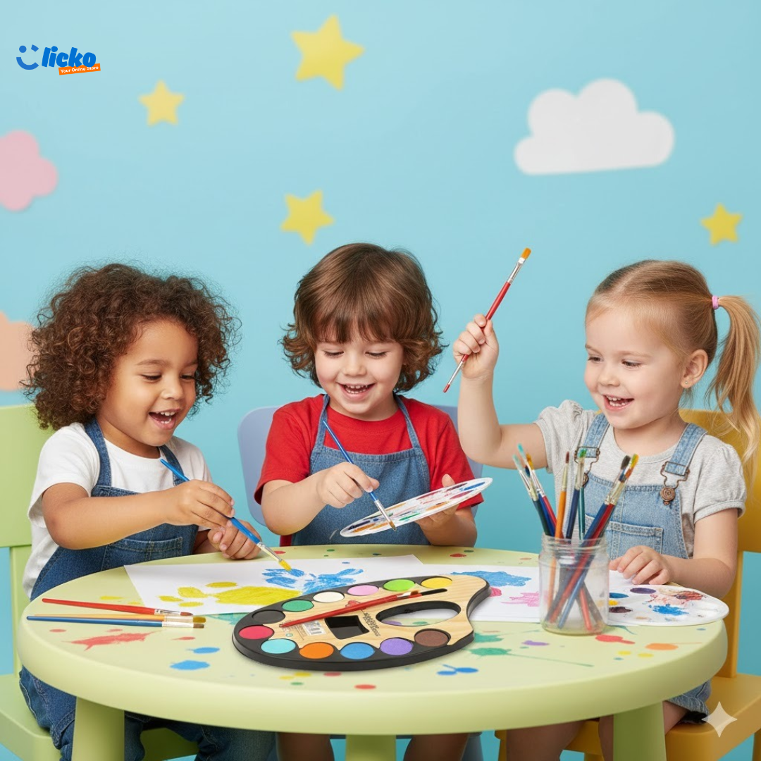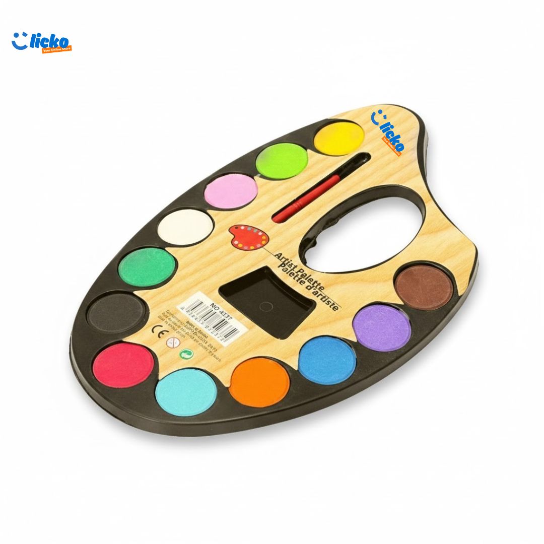 This set provides a convenient, kidney-shaped palette featuring 12 vibrant watercolor paint cakes suitable for children and beginners, offering a variety of colors for basic painting projects. The palette is designed with a wooden grain effect on a black base and includes a small brush securely held in the center for immediate artistic use.